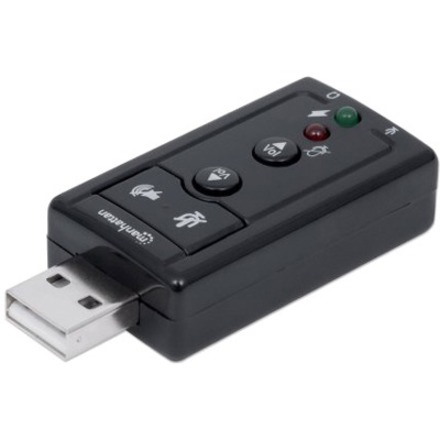 Ideal for desktop, notebook and netbook computers, the Manhattan Hi-Speed USB 3D 7.1 Sound Adapter instantly creates microphone-in and audio-out ports through any USB port. Easily connect headsets, microphones and speakers equipped with 3.5 mm cables that are too short to reach ports in awkward or inconvenient locations comfortably. With plug-and-play and hot-swap capabilities, it easily replaces inoperative sound cards, bypasses damaged audio ports and improves access without special drivers or software. A built-in Class-B power amplifier utilizes USB bus power, eliminating the need for external energy supplies or additional cables. Support for 3D audio and virtual 7.1 surround sound and built-in sound effects with a 10-band equalizer deliver rich, high-quality experiences with familiar USB convenience and functionality.