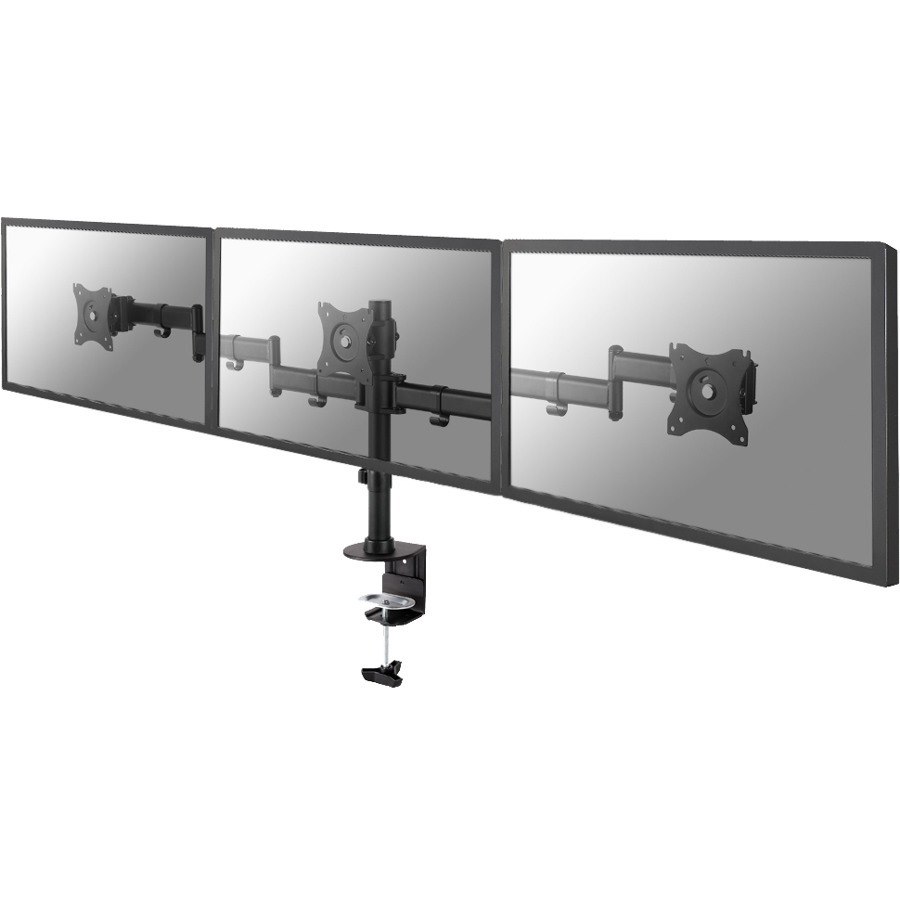 Newstar Tilt/Turn/Rotate Triple Desk Mount (clamp) for three 10-27" Monitor Screens, Height Adjustable - Black. Tilt, Turn (left and right) and Rotate triple desk mount suitable for three screens between 10" and 27" and up to 24kg max combined weight. Height Adjustable. This model allows you to tilt your screens forward, turn, rotate and adjust the height to choose the ideal viewing angle to suit your needs. Mount suitable for VESA sizes: 75x75 and 100x100mm. Newstar have over 20 years experience providing high quality mounts to suit a wide variety of needs, which include the mounting of screens, tablets, projectors, laptops and PCs. One thing that remains the same across our range is our insistence on high specification materials to ensure optimum reliability, backed up by the no quibble 5 year warranty. As the old saying goes, "You get what you pay for".
